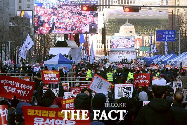 이날 촛불행동 등은 이재명 대표의 구속영장을 전면 거부하고 윤석열 대통령을 타도한다는 내용의 집회를 열었다. 집회는 김남국, 장경태 등 더불어민주당 친명계 의원들의 발언과 참가자들의 발언, 구호, 응원가 등 순으로 진행됐다.