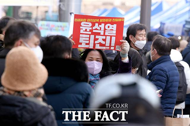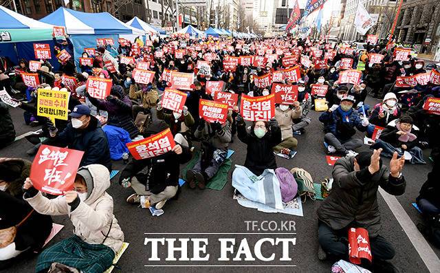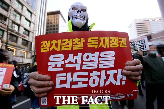 이날 촛불행동 등은 이재명 대표의 구속영장을 전면 거부하고 윤석열 대통령을 타도한다는 내용의 집회를 열었다.