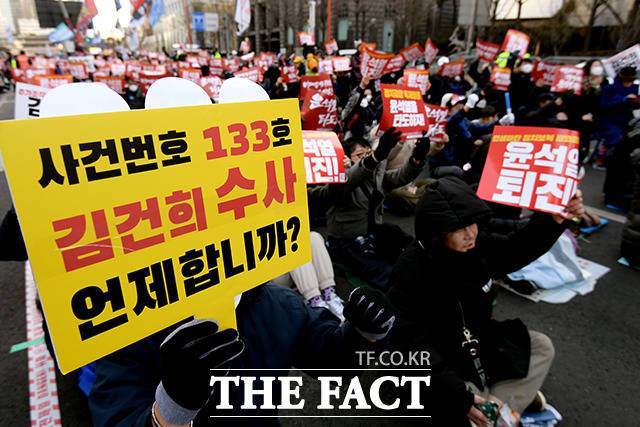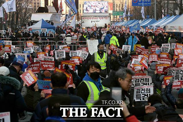 [더팩트ㅣ이선화 기자] 25일 오후 서울 중구 숭례문 일대에서 촛불승리전환행동 등 집회 참가자들이 '윤석열 퇴진! 김건희 특검!' 28차 촛불대행진 집회에 참석해 구호를 외치고 있다.