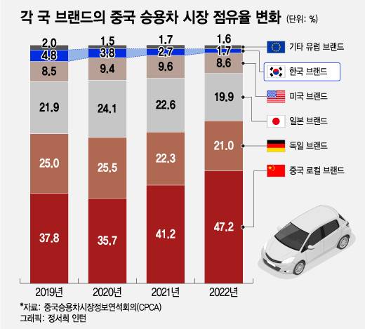 중국 승용차시장정보연석회의(CPCA)에 따르면 중국 로컬 브랜드의 중국 승용차 시장 점유율은 2019년 37.8%에서 2022년 47.2%로 9.4%포인트 상승했다. 특히 전기차 판매가 급증한 2021~22년 2년 동안 로컬 브랜드 비중이 급증하며 전기차의 영향을 그대로 드러냈다. 반면 전동화 속도에서 로컬 브랜드를 따라가지 못한 독일·일본계 브랜드는 지난 2년 동안(2020년~2022년 사이) 점유율이 각각 4.5%포인트, 4.2%포인트 하락했다. 현대차그룹의 점유율은 같은 기간 3.8%에서 1.7%로 반토막났다.