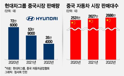 현대차그룹의 중국 시장 판매량은 2020년 72만6000대에서 2022년 35만4000대로 쪼그라들었다. 지난해 현대차가 25만9000대를 팔았으며 기아는 10만대에 못 미치는 9만5000대 판매에 그쳐 존립의 기로에 놓였다. 중국 자동차 시장에서 10만대는 브랜드 유지를 위한 최소한의 판매량으로 여겨진다.