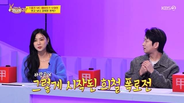 김희철은 당황해 "앨범 홍보 안 해?"라며 말을 돌리려 했지만 오하영은 "아직 앨범이 안 나왔다"고 답했다. 이에 김희철이 "왜 나왔냐"고 하자 "저는 방송인인데 나오면 안 되냐"고 받아쳤고 김희철은 "저는 녹화 여기까지 하겠다"면서 녹화 중단을 선언해 웃음을 자아냈다. (사진=KBS 2TV '사장님 귀는 당나귀 귀' 캡처)