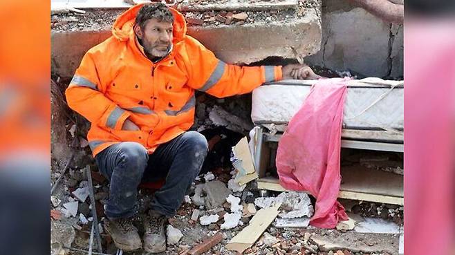 튀르키예 강진으로 무너진 건물 잔해 사이로 삐져나온 딸의 손을 부여잡은 채 자리를 뜨지 못하던 한 아버지.
