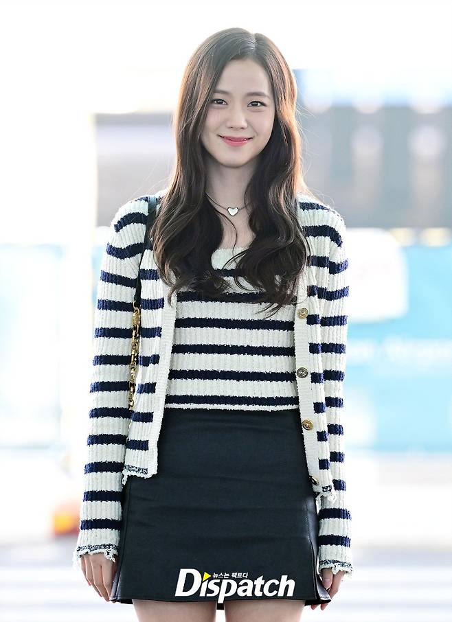 지수는 스트라이프 가디건과 초미니 스커트로 산뜻한 공항패션을 선보였다. 청순한 비주얼과 사랑스러운 미소도 돋보였다.