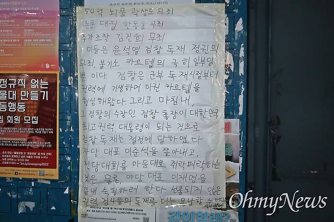 대자보 작성자는 "이들은 윤석열 검찰독재 정권의 무죄, 불기소 카르텔의 극히 일부일 뿐"이라며 "검찰은 군부독재 시절부터 권력에 기생하며 이권 카르텔을 형성해왔다. 그리고 마침내 그 검찰의 수장인 검찰총장이 대한민국 최고 권력 대통령이 되는 것으로 검찰독재는 절정에 달하였다"라고 강조했다.