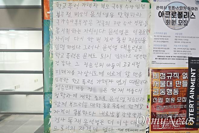 <오마이뉴스>가 확인한 바에 따르면, 27일 늦은 오후 서울대 중앙도서관 게시판에 "정순신의 아들 정◯◯은 현재 서울대 철학과에 재학 중으로 윤석열·정순신과 함께 부끄러운 대학 동문 목록에 함께할 자격이 충분하다"는 내용의 대자보가 게시됐다.
