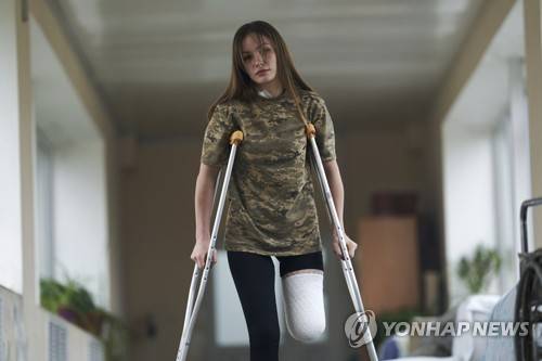 Ruslana Danylkina, 19, a Ukrainian soldier who lost her leg in the fighting near Kherson, is seen in a city hospital in Odesa, Ukraine, Monday, Feb. 27, 2023. (AP Photo/Libkos)