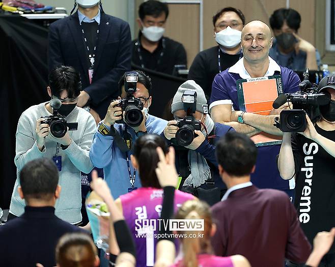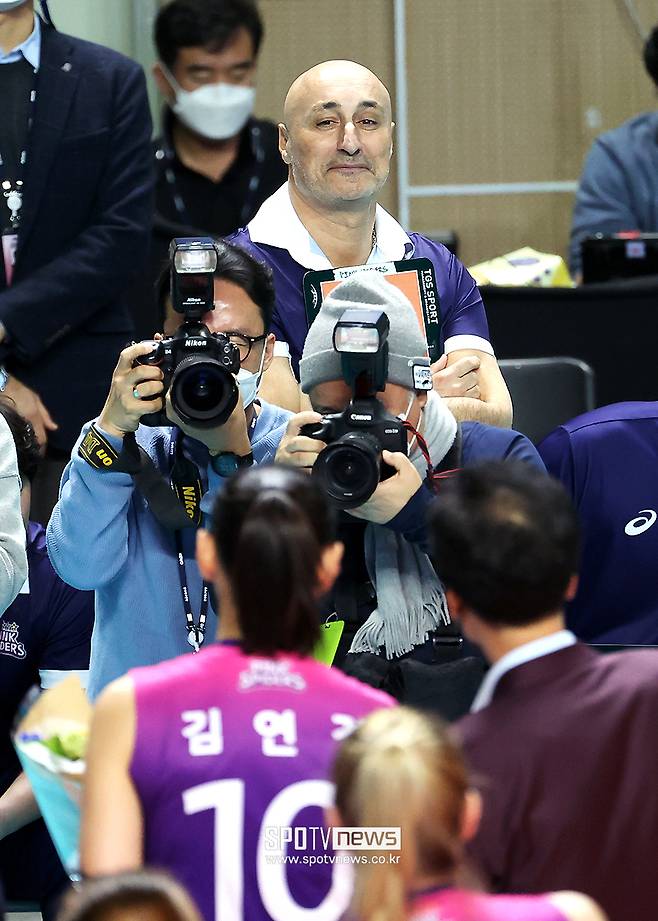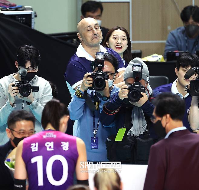 [스포티비뉴스=장충, 곽혜미 기자] 흥국생명 새 사령탑 아본단자 감독이 김연경의 MVP 선정 기념 촬영에 눈을 떼지 못했다.