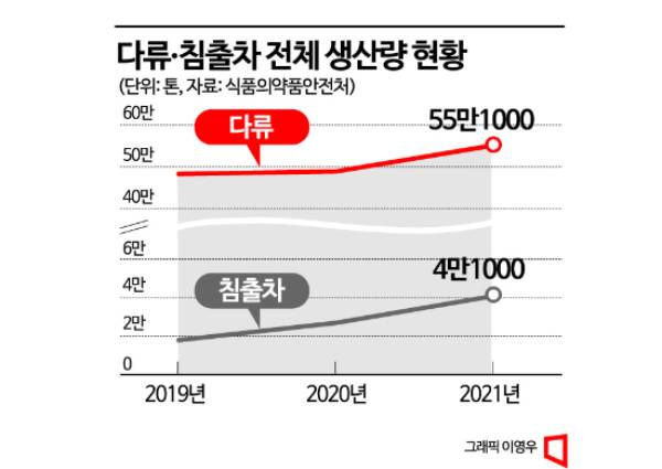 특히 전체 다류 가운데 침출차의 증가세가 두드러졌다. 2021년 침출차 생산량은 4만1012t으로 2020년(2만7488t)보다 1만3500여t 증가했다. 다류는 식물성 원료를 제조, 가공한 식품으로 크게 침출차, 액상차, 고형차로 나뉘는데, 침출차는 식물의 어린싹이나 잎, 꽃, 줄기 등을 물에 침출해 그 여액을 음용하는 식품을 말한다. 주로 녹차, 홍차, 허브차 등 납작한 티백으로 유통되는 것이 특징이다.