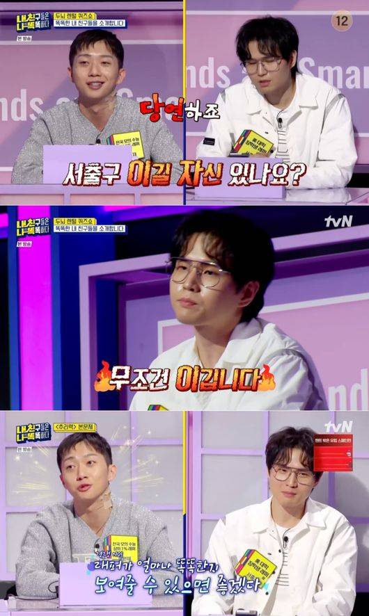우원재와 서출구는 비주얼부터 이날 '내친나똑'에 남다른 각오를 드러냈다. 우원재는 트레이드 마크 같은 비니를 벗고 출연한 바. 그는 "어머니가 너무 좋아하셨는데 비니 좀 벗어 달라고 하시더라. 그래서 벗고 왔다"라며 "오늘도 이길 자신이 있다"라며 강한 자신감을 보였다.