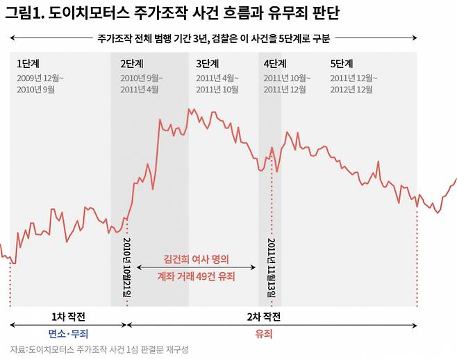 앞서 검찰은 2021년 12월 권 전 회장 등을 재판에 넘기면서, 도이치모터스의 주가조작이 2009년 12월부터 2012년 12월7일까지 3년 동안 총 다섯 단계에 걸쳐 이뤄졌다고 판단했다. 그리고 각 단계들을 각각의 개별 범죄가 아닌 ‘하나로 연결된 범죄(포괄일죄)’로 묶었다. 재판부는 검찰이 주장한 ‘하나의 범죄’를 둘로 쪼갰다. 주가조작 범행이 진행된 3년 사이 주포가 바뀐 시점(이씨→김씨)을 기준으로 1차 작전, 2차 작전으로 구분했다. ‘주범’인 주포가 바뀌면서 범행 수법과 이용된 계좌 및 자금 모집 방식, 주가 변동 정도와 거래량 등이 전부 달라진 만큼, 하나의 범죄로 볼 수 없다고 판단했다(〈그림 1〉 참조).