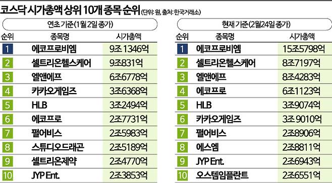28일 한국거래소에 따르면 코스닥 상위 10개 종목의 시가총액은 57조7695억원(26일 기준)으로 집계됐다. 올해 1월2일 종가 기준 44조5346억원 대비 29.7% 증가한 수준이다.