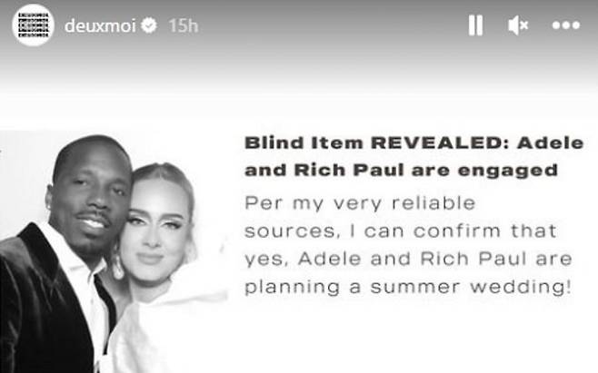 이에 가십을 다루는 Deux Moi 측은 아델과 리치 폴이 올해 여름에 결혼한다며 이는 매우 신뢰할 수 있는 정보원에게 확인했다고 밝혔다.