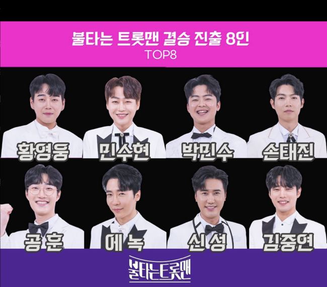 황영웅은 지난 21일 10회 방송을 통해 민수현-박민수-손태진-공훈-에녹-신성-김중연과 함께 결승전 진출에 성공했다. 인기투표와 응원투표 부동의 1위를 기록 중인 그는 남진의 ‘영원한 내 사랑’을 열창하며 384점이라는 준결승전 최고 득점을 올렸다.