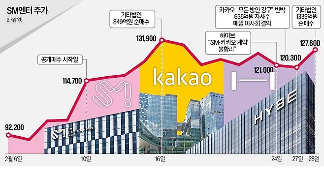 하이브를 울린 건 의문의 기타법인이었다. 지난 16일에 이어 이날도 기타법인이 SM엔터 주식을 1339억원어치나 매입하면서 주가를 끌어올렸다. 하이브가 이날 개장 전 금융감독원에 2월 16일 IBK증권 계좌로 SM엔터 주식을 대량 매입해 공개매수를 방해한 기타법인을 조사해달라고 요청했지만 아랑곳하지 않았다. 시장에선 카카오 측이 SM엔터 주식을 매입한 것으로 보고 있다. 하이브와 카카오의 다툼이 예상된다. SM엔터 경영권 전쟁 2라운드가 시작됐다는 분석이다.