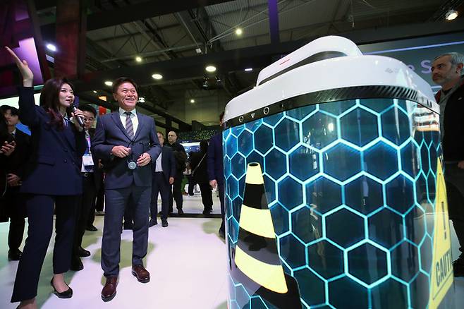 SKT ‘인포테인먼트 로봇’ 박정호 SK 부회장이 27일(현지시간) ‘모바일월드콩그레스(MWC) 2023’ SK텔레콤 부스를 둘러보고 있다. 오른쪽은 자율주행을 하면서 정보, 동영상 등을 송출하는 인포테인먼트 로봇이다. 바르셀로나=뉴스1