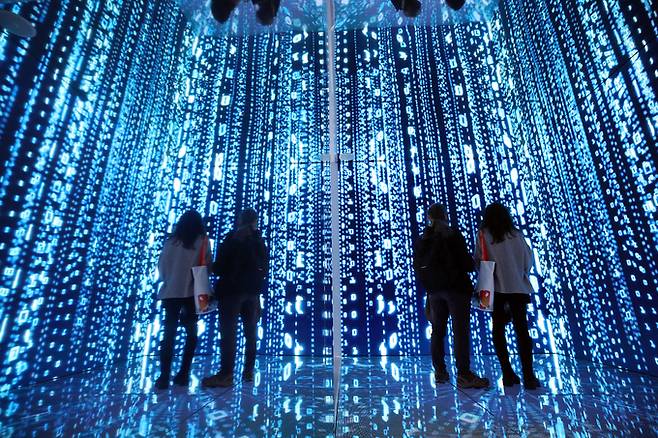 KT ‘디지코 전략’ 이미지 형상화 27일(현지시간) 모바일월드콩그레스(MWC) 2023 KT 부스를 방문한 관람객들이 KT의 디지코(디지털 플랫폼 기업) 전략을 이미지로 형상화한 영상을 보고 있다. 바르셀로나=뉴스1