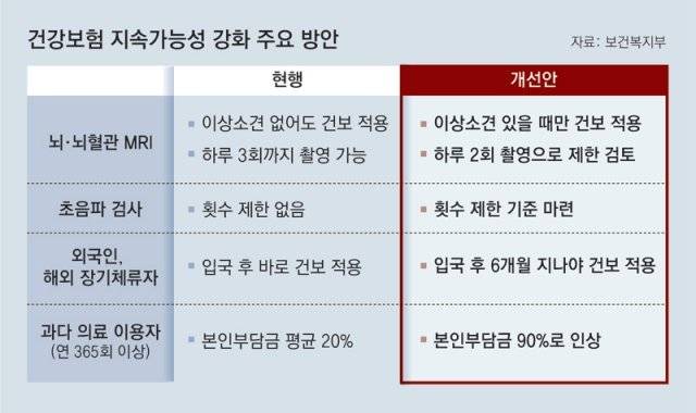 정부는 건보 재정을 지키기 위해 민간 실손보험의 보장 범위와 수준도 줄여나갈 방침이다. 실손보험이 보장하는 범위가 넓어져 환자 본인의 부담금이 줄어들면, 그만큼 환자가 불필요한 진료까지 받는 ‘도덕적 해이’가 벌어지기 쉽다는 것이다. 이와 함께 연간 365회 이상 외래 진료를 받는 과다 의료 이용자에 대해선 현재 20% 수준인 본인부담금을 90%까지 올리는 방안도 검토 중이다.