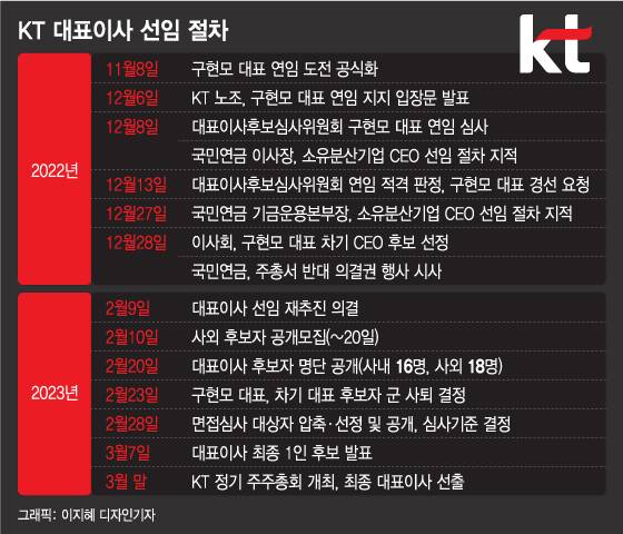 앞서 후보 심사대상자를 선정하는 KT 이사회내 지배구조위원회는 사내·외 후보에 대한 객관적 검증을 위해 경제·경영·리더십·미래산업·법률 분야의 외부 전문가 5인으로 인선자문단을 구성했다고 밝혔다. 외부 전문가는 권오경 한양대 석좌교수, 김주현 김앤장 법률사무소 변호사, 신성철 정부 과학기술협력대사(전 카이스트 총장), 정동일 연세대 경영대학 교수, 정해방 전 기획예산처 차관 등 5인이다. 인선자문단은 국민연금과 30대주주, KT노조등으로부터 의견을 수렴, KT 대표상(像)으로 △ICT 전문지식 △KT 관련 업무 경험 △KT 미래비전 제시 △노사관계 발전 등을 제시했는데 사실상 KT 전현직 임원을 염두에 둔 것이라는 평가다.