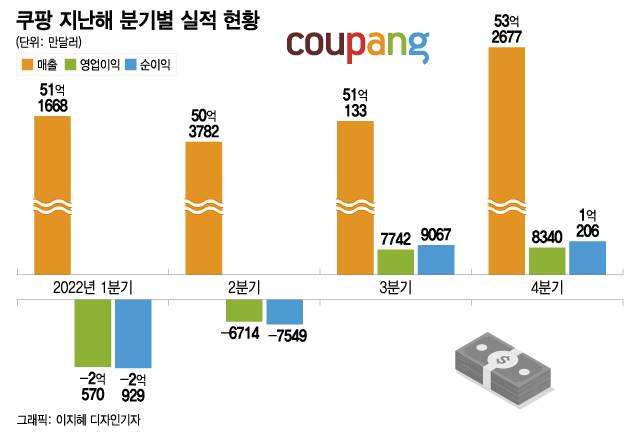 영업 활동으로 벌어들인 사업의 순수 현금흐름을 나타내는 연간 조정 EBITDA(상각 전 영업이익) 기준 첫 연간 흑자도 기록했다. 규모는 3억8121만달러(4925억원)다. 쿠팡은 지난해 1분기부터 4분기 연속 적자 폭을 줄이고 있는데, 이 기세라면 올해 연간 흑자 달성이 가능할 전망이다.