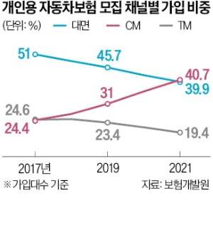 CM을 통해 개인용 자동차보험에 가입한 비중은 2017년 24.4%에서 2021년 40.7%로 급증해 대면 채널(39.9%)을 넘어섰다. 종신보험처럼 특약 및 구조가 복잡한 상품은 여전히 대면 판매 비중이 높다.