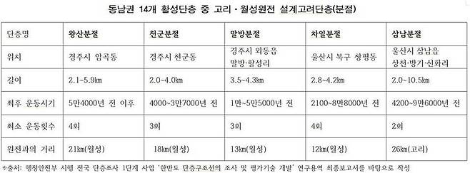 규모 6.5 이상의 강진이 일어날 수 있는 활성단층(설계고려단층) 5개가 부산·울산의 고리원전과 경북 경주의 월성원전 주변에 있다는 사실이 정부 용역 단층조사를 통해 뒤늦게 확인됐다. 이들 활성단층은 과거 원전 건설을 위한 지질 조사에서는 확인되지 않아, 원전 설계 때 고려되지 않았다. 월성과 고리에는 원전 14기가 건설돼 있고, 현재 2기가 건설 중이어서 내진 안전성을 둘러싼 우려의 목소리가 나온다.