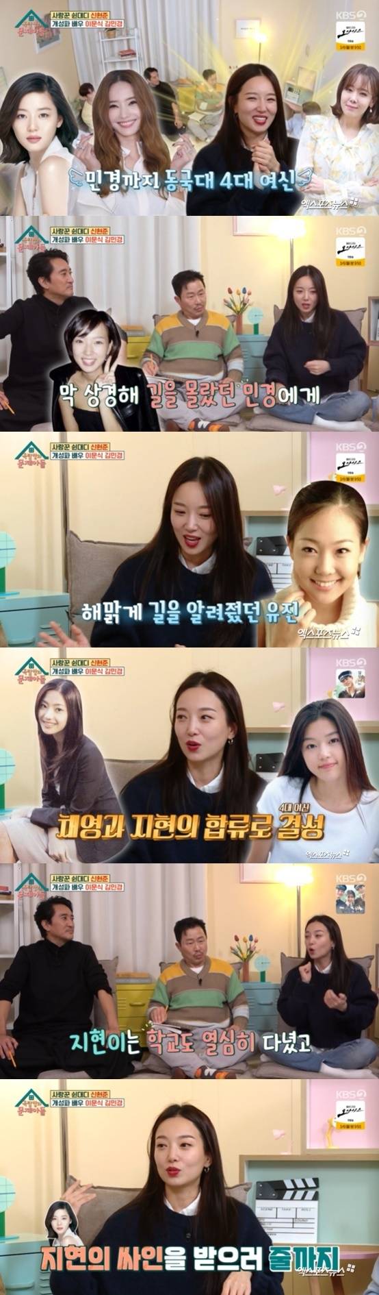 김민경은 "(네 명이) 친했다. 입학 전에 합격증을 받으러 가지 않나. 대구에서 기차 타고 올라와서 체육관으로 가고 있는 너무 예쁜 여자애가 걸어가더라. 혹시 체육관에 어떻게 가는지 아냐고 물었는데 되게 밝게 '저와 같이 가요'라고 하더라. 그게 (소)유진이었다"고 말했다.