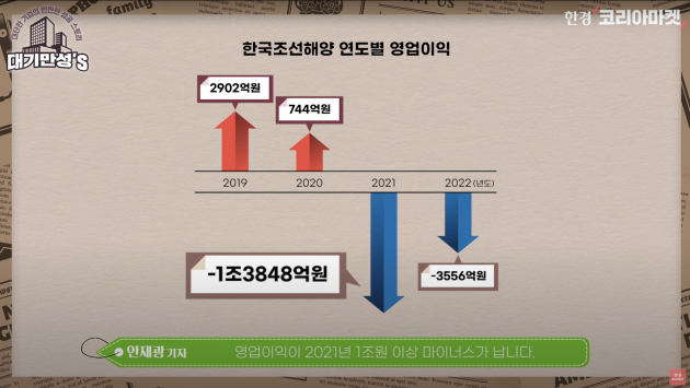 이 탓에 HD현대그룹 안에서 조선 사업 총괄하는 중간 지주사 한국조선해양의 영업이익이 2021년 1조원 이상 마이너스가 납니다. 작년에도 적자가 이어져서 3000억원 이상 손실이 났어요.