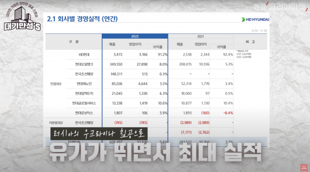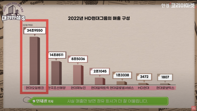 정유 사업을 하는 현대오일뱅크 덕분인데요. 작년에 러시아가 우크라나이를 침공한 뒤 유가가 뛰면서 현대오일뱅크가 사상 최대 실적을 냈습니다. 매출이 35조원. HD현대그룹 매출의 절반을 넘었고. 이익은 2조8000억원. 그룹 전체의 80%를 책임졌습니다. 현대오일뱅크 덕분에 먹고 살았어요.