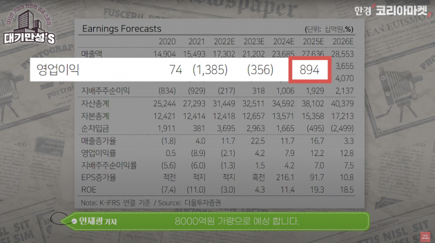 이런 배들의 공사를 진행하면 매출, 이익이 확 좋아질 겁니다. 증권사들이 실제로 그렇게 보죠. HD현대의 조선 중간 지주사, 한국조선해양의 영업이익을 8000억원가량으로 예상합니다. 잘하면 1조원도 넘길 수 있다고 봐요.