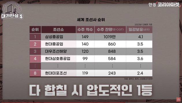 한국조선해양은 현대중공업, 현대삼호중공업, 현대미포조선을 자회사로 거느리고 있는데요. 이들 자회사는 작년 말 기준 2~3년 치 일감을 확보해놓고 있습니다. 참고로 이 회사들은 세계 조선소 순위로 각각 2등, 4등, 8등인데. 다 합치면 압도적인 1등이에요.