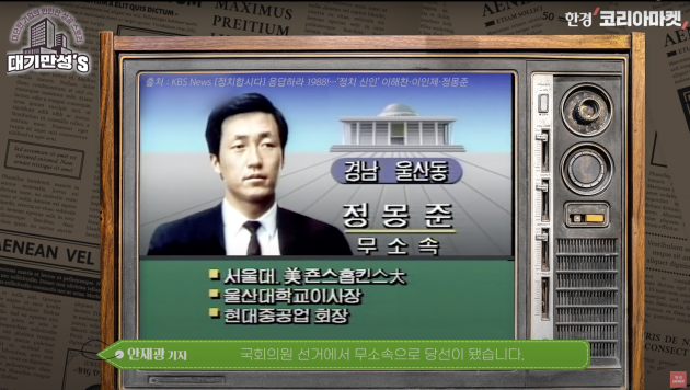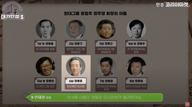 정주영 회장은 평생 큰 자부심이었던 조선업을 여섯째 아들인 정몽준 이사장에게 물려줬어요. 정몽준 이사장 역시 정주영 회장의 큰 자부심이었습니다. 정주영 회장이 초등학교, 당시엔 소학교로 불렸죠. 소학교 밖에 못 나와서 학벌 콤플렉스가 있었는데, 정몽준 회장이 서울대 경제학과를 나왔거든요. 아들이 여덟명이나 있었는데 정몽준 이사장이 공부를 가장 잘했다고 합니다.