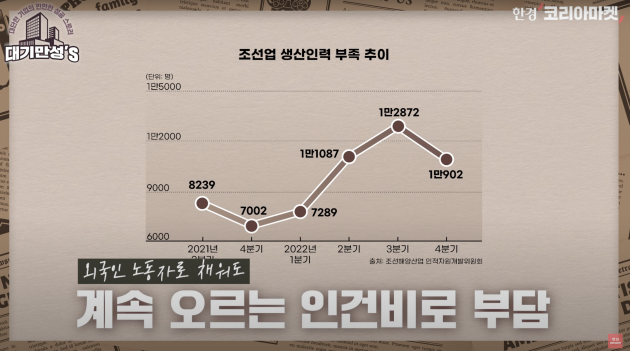 여러모로 조선업이 좋아지긴 하는데요. 아직 어려움도 많습니다. 우선 일할 사람 구하는 게 쉽지 않아요. 과거 안 좋은 시절에 사람들이 조선소를 많이 떠났는데 돌아오지 않고 있어요. 돈은 많이 안 주는데 위험하고 힘들어서 그렇습니다. 작년 3분기 국내 조선소 전체로 1만명이 더 필요하다고 합니다. 당장 급한 대로 외국인 근로자를 받아서 채운다고 하는데. 인력난 탓에 인건비가 계속 오르고 있어서 이건 회사에 부담이죠.