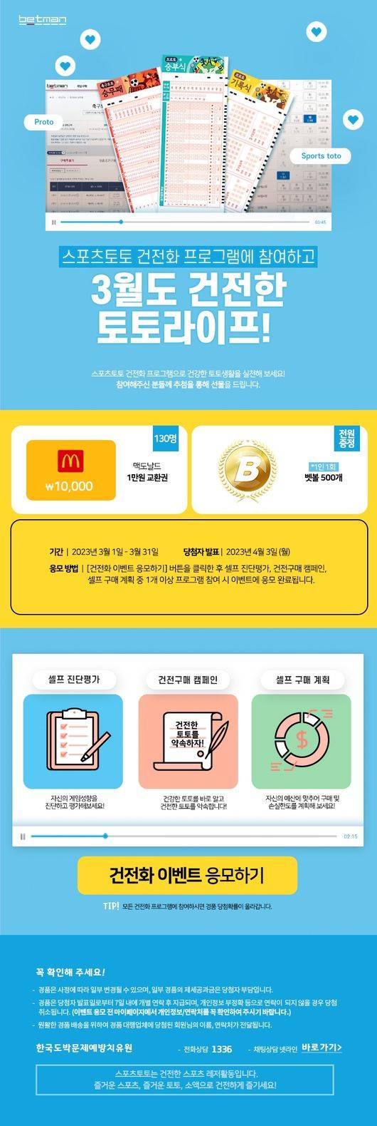 국민체육진흥공단이 발행하는 체육진흥투표권 스포츠토토의 공식 온라인 발매사이트 베트맨(www.betman.co.kr)의 2023년 건전화 이벤트인 "3월도 건전한 토토라이프!"를 이번 달 31일(금)까지 진행한다고 밝혔다.