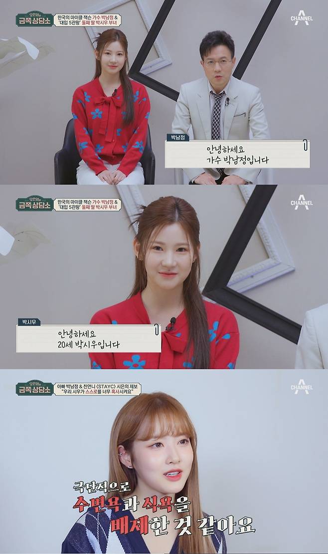 본격 상담에 앞서 박남정은 첫째 딸 시은은 걸그룹 STAYC의 메인보컬을, 둘째 딸 시우는 연극영화과 대입 5관왕임을 밝히며 두 딸의 근황을 소개한다.