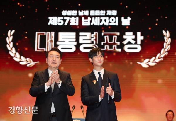 제57회 납세자의 날 기념식이 3일 서울 강남구 코엑스에서 열려 윤석열 대통령이 배우 김수현에게 대통령 표창을 수여한 후 기념촬영을 하고 있다.