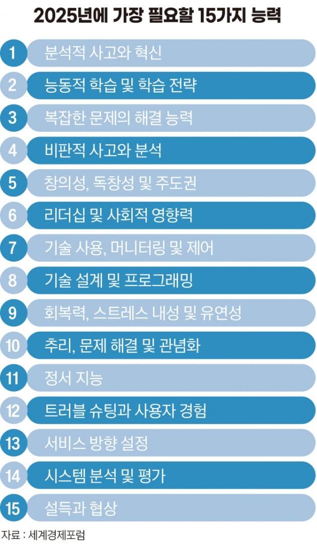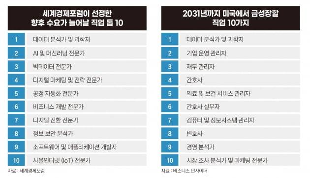 한국에서도 유망 직종으로 꼽힌 직업군은 일맥상통한다. 한국고용정보원이 지난 1월 발표한 자료에 따르면 AI 전문가, 빅데이터 전문가, 미디어 콘텐츠 창작자, 3D프린팅 운영 전문가, 증강현실 전문가 등 IT 인력이 현재 활성화되고 향후에도 지속 성장할 수 있는 직업으로 꼽혔다.