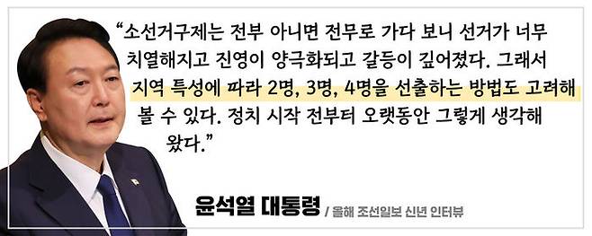 올해 초, 신년 인터뷰에서 윤석열 대통령은 '중대선거구제 도입'을 언급했습니다. 지역 특성에 따라 2명에서 4명까지 뽑는 중대선거구제를 말했는데, 몇 명을 뽑느냐에 따라 제도의 효과에 상당한 차이가 있습니다. 명확히 정해진 것은 없지만 보통 한 선거구에서 2명에서 4명까지 선출하는 것을 중선거구제, 5명 이상을 선출하는 걸 대선거구제로 부릅니다.
