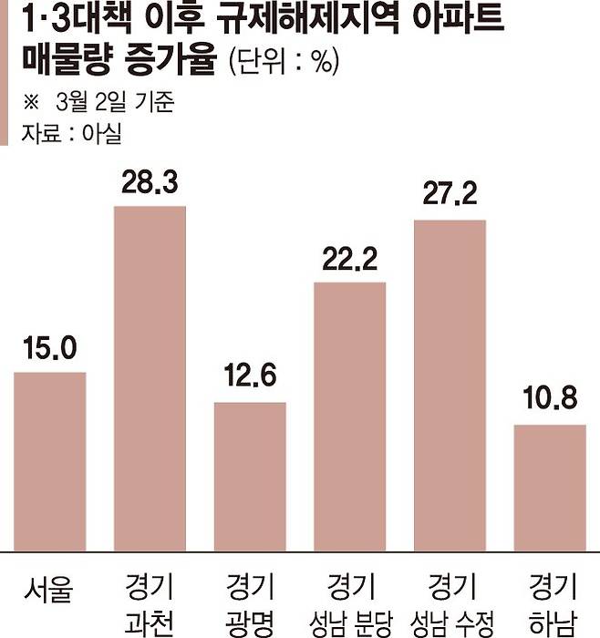 기존에 비규제지역이 대부분인 경기도의 아파트 매물량이 같은 기간 8.6% 늘어난 데 비하면 증가율이 두배 수준이다. 하지만, 1·3대책에서 서울과 함께 규제가 풀린 경기 과천(28.3%)·광명(12.6%)·성남 분당구(22.2%)·성남 수정구(27.2%) 등은 경기권 평균 매물 증가율을 웃돌았다.