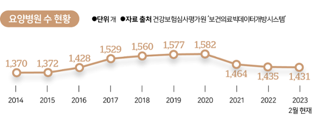 5일 보건복지부와 건강보험심사평가원(심평원)에 따르면, 전국 요양병원은 2010년 867개에서 2020년 1,582개로 10년 만에 두 배 가까이 늘었다. 하지만 2021년 1,464개로 100개 이상 줄어들었다. 지난해에는 1,435개로 감소세가 이어졌고 지난달까지는 1,431개로 집계됐다. 대한요양병원협회 측은 "코로나19가 감소세에 영향을 줬다"며 "2021년 3월 의료법 개정에 따라 정신병원이 요양병원에서 제외된 것도 원인"이라고 분석했다.