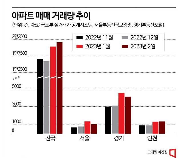 집값이 크게 떨어진 인천의 거래량 회복세도 가팔랐다. 지난해 12월 900건대에 머물던 아파트 매매 거래량이 올해 1·2월 연속 1300건대를 기록했다. 1월은 1367건, 2월은 1393건이다. 실거래 신고 기한이 남아 있어 2월 거래량은 1400건을 돌파할 가능성이 높다.