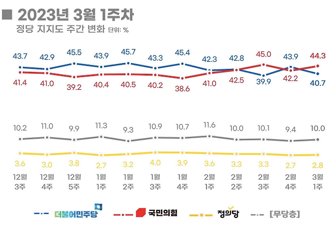 6일 여론조사기관 리얼미터의 정례 여론조사(미디어트리뷴 의뢰로 지난달 27일~이달 3일 4일간 전국 만 18세 이상 성인남녀 2006명을 대상으로 ARS 자동응답 방식으로 진행)에 따르면 민주당 지지율은 전주대비 3.2%포인트 떨어진 40.7%였다. 국민의힘은 2.1%포인트 상승한 44.3%를 기록했다. 양당 간 지지율 격차는 3.6%포인트로 오차범위 내 접전 양상을 보였다.