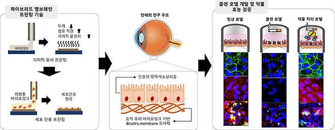 이에 연구팀은 망막 색소 상피의 기저막과 단층 구조를 제작할 수 있는 프린팅 기술을 개발했습니다.