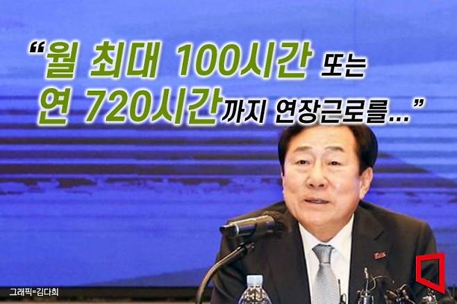 김기문 중소기업중앙회 회장은 "업무량이 폭증할 땐 월 최대 100시간 또는 연 720시간까지 연장근로를 할 수 있도록 개선해야 한다"고 주장했다.