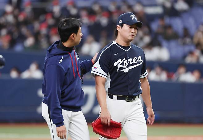 | ▲ 교체되는 고우석 6일 오사카돔에서 열린 WBC 한국 대표팀과 일본 오릭스와의 연습경기. 한국 고우석이 8회말 어깨 통증을 호소하며 교체되고 있다. |