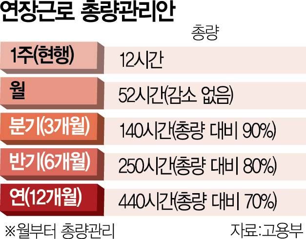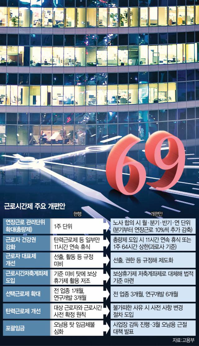 고용부는 이날 주 단위인 연장근로 단위를 월·분기·반기·연으로 확대하는 방식의 총량관리제를 도입해 근로시간제를 다양화하는 안을 냈다. 개편안대로라면 선택지는 현행 주 52시간제와 주 64시간제, 주 69시간제 등 세 가지다. A 대표 기업이나 개발프로젝트 완료가 시급한 정보기술(IT) 기업, 성수기 일감이 몰린 기업 등 연장근로가 더 필요한 사업장은 주 64시간제 또는 주 69시간제를 활용하면 된다.
