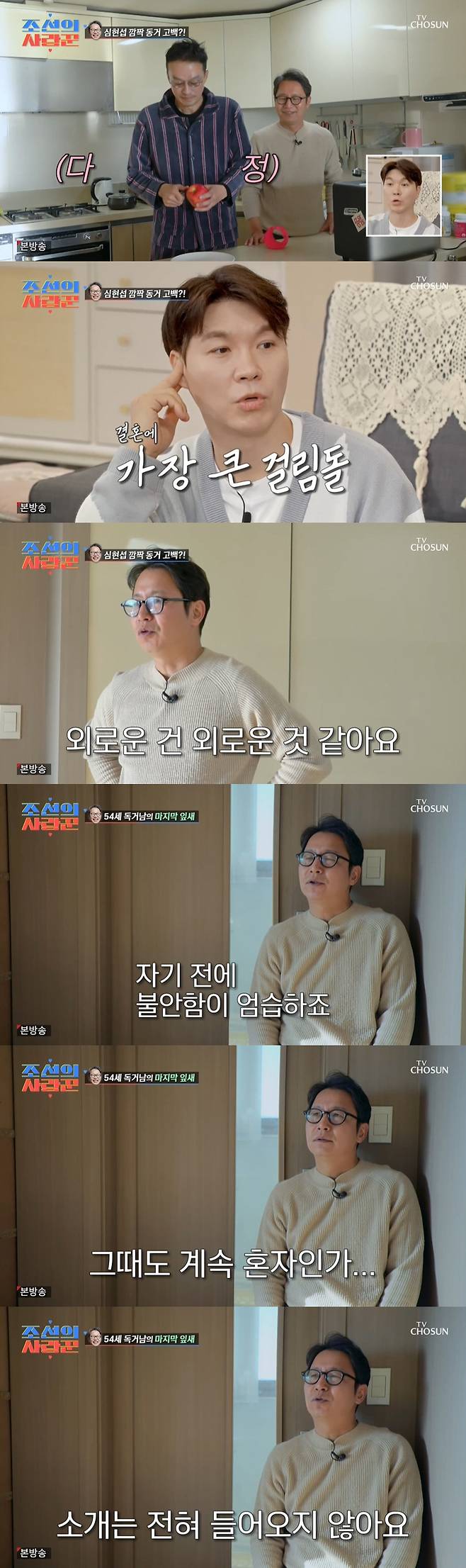그때 제작진은 "친구분과 재밌게 사시는 거 같다"고 하자, 심현섭은 "코드가 맞는다. 둘이 걱정하는 게, 너무 서로 익숙해지면 이 생활에 물들어가기 때문에 근데 아무리 두 명이 살아도 외로운 건 외롭다"고 털어놨다. 심현섭은 "자기 전에 불안함이 엄습하다. 눈 뜨면 또 해가 뜰텐데 그때도 계속 혼자인가"라며 "소개는 전혀 들어오지 않는다. 옛날엔 소개도 조금 들어왔다. 지금은 나이가 있으니까"라고 했다.