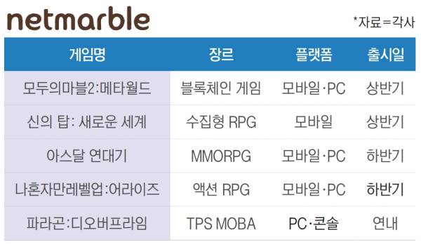상반기에는 ‘모두의마블2: 메타월드’와 '그랜드크로스W', ‘신의탑: 새로운 세계’가, 하반기에는 ‘아스달 연대기’와 ‘나 혼자만 레벨업: 어라이즈’, ‘원탁의 기사’ ‘세븐나이츠 핑거(가제)’가 각각 출격할 예정이다. ‘파라곤: 디 오버프라임’과 ‘하이프스쿼드’는 연내 출시를 목표로 개발되고 있다.