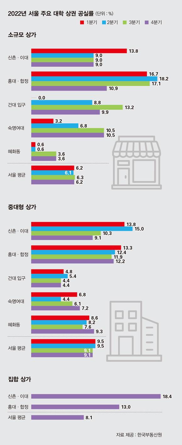 특히 대학가 소규모 가게들이 경기 침체의 직격탄을 맞았다. 한국부동산원의 지난해 공실률 통계를 전수 분석해 보니 4분기 기준 홍익대·합정(10.9%), 숙명여대(10.5%), 건국대(9.9%), 신촌·이화여대(9.0%) 등의 소규모 상가(2층 이하이고 연면적 330㎡ 이하) 공실률은 서울 평균(6.2%)과 전국 평균(6.9%)을 훌쩍 뛰어넘었다. 코로나19 발생 전인 2019년 4분기(구 표본 기준) 홍대·합정(7.3%), 건대(0.0%), 신촌(0.0%) 등의 소규모 매장 공실률과 비교하면 차이가 확연히 드러난다.
