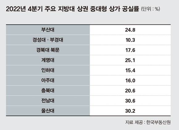 서울이 이 정도인데, 불경기 영향을 더욱 많이 받는 지방대학 상권은 더욱 심각할 수밖에 없다. 주요 지방대 상권의 경우 중대형 상가 공실률이 두드러지게 높았다. 전남대(30.6%)와 울산대(30.2%)가 30%대, 계명대(25.1%)와 부산대(24.8%), 충북대(20.6%)가 20%를 넘는 등 전국 평균(13.2%)을 크게 뛰어넘는 곳이 많았다.
